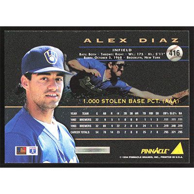 This is a 1994 Pinnacle Alex Diaz baseball card. The card is #416 and pictures show condition.