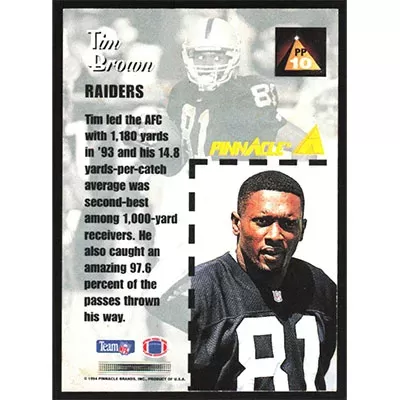 This is a 1994 Pinnacle Performers Tim Brown football card. The card is #PP10 and pictures show condition.