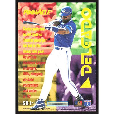 This is a 1994 Pinnacle Super Rookie Carlos Delgado baseball card. The card is #SR1 and pictures show condition.