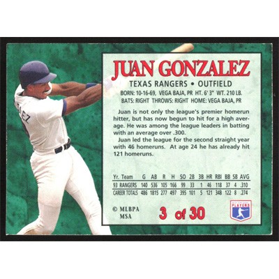 This is a 1994 Post Juan Gonzalez baseball card. The card is #3 and pictures show condition.
