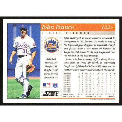 This is a 1994 Score John Franco baseball card. The card is #122 and pictures show condition.