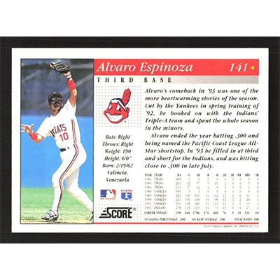 This is a 1994 Score Alvaro Espinoza baseball card. The card is #141 and pictures show condition.