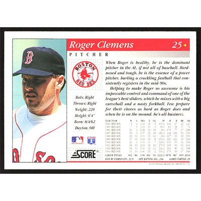 This is a 1994 Score Roger Clemens baseball card. The card is #25 and pictures show condition.