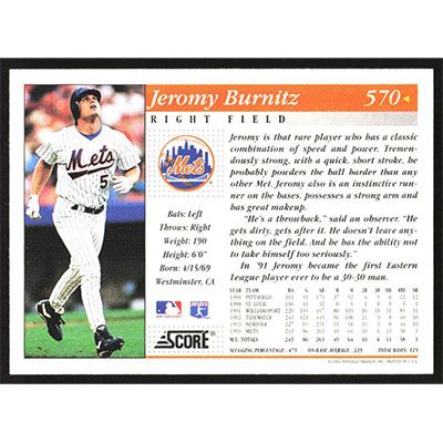 This is a 1994 Score Jeromy Burnitz baseball card. The card is #570 and pictures show condition.