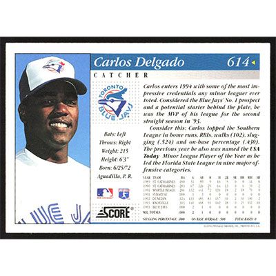 This is a 1994 Score Carlos Delgado baseball card. The card is #614 and pictures show condition.