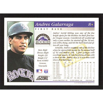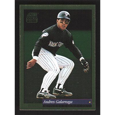 This is a 1994 Score Gold Rush Andres Galarraga baseball card. The card is #8 and pictures show condition.
