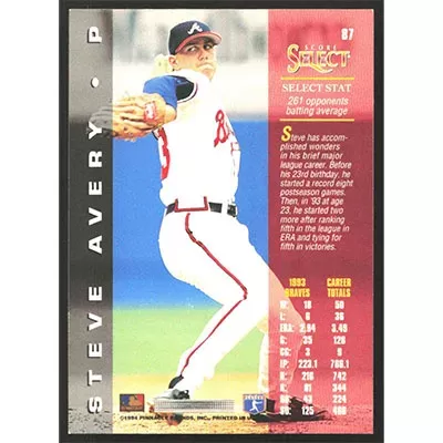 This is a 1994 Select Steve Avery baseball card. This card has been signed, in blue, by Steve Avery, and is guaranteed authentic by Ballcardz.com. The card is #87 and pictures show condition.