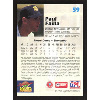 This is a 1994 Signature Rookies Draft Picks Paul Failla baseball card. The card is #59 and pictures show condition.