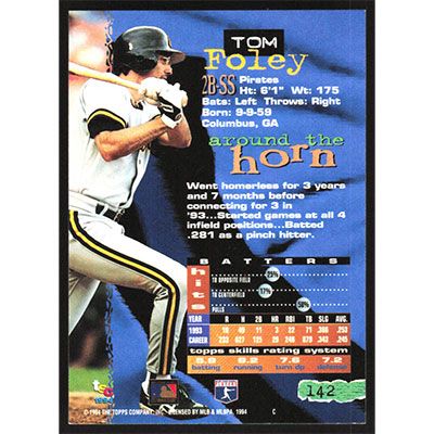 This is a 1994 Stadium Club Tom Foley baseball card. The card is #142 and pictures show condition.