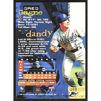 This is a 1994 Stadium Club Greg Gagne baseball card. The card is #159 and pictures show condition.