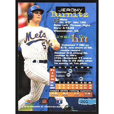 This is a 1994 Stadium Club Jeromy Burnitz baseball card. The card is #201 and pictures show condition.