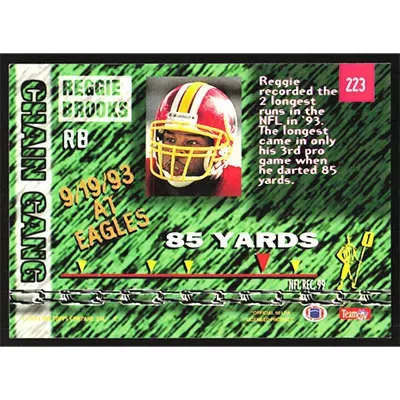 This is a 1994 Stadium Club Reggie Brooks Chain Gang - Longest Rush football card. The card is #223 and pictures show condition. Team(s): Washington Redskins