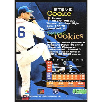 This is a 1994 Stadium Club Steve Cooke baseball card. The card is #47 and pictures show condition.