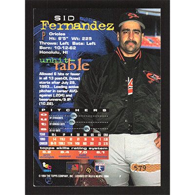This is a 1994 Stadium Club Sid Fernandez baseball card. The card is #579 and pictures show condition.