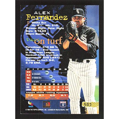 This is a 1994 Stadium Club Alex Fernandez baseball card. The card is #583 and pictures show condition.