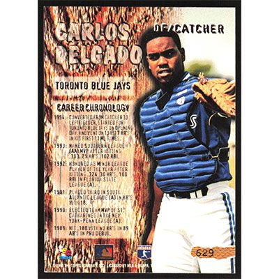 This is a 1994 Stadium Club Carlos Delgado Rookie Rocker baseball card. The card is #629 and pictures show condition.