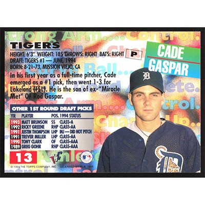This is a 1994 Stadium Club Draft Picks Cade Gaspar baseball card. The card is #13 and pictures show condition.
