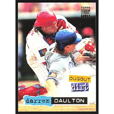 This is a 1994 Stadium Club Dugout Dirt Darren Daulton baseball card. The card is #12 and pictures show condition.