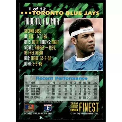 This is a 1994 Stadium Club Team Finest Roberto Alomar baseball card. The card is #1 and pictures show condition.