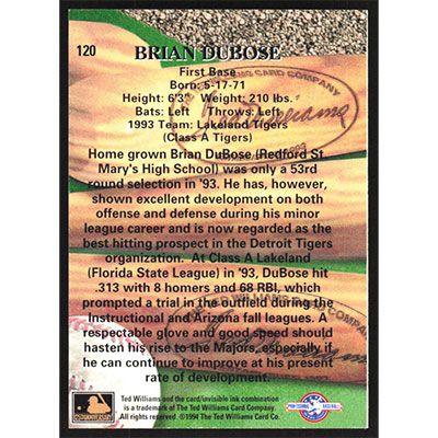 This is a 1994 Ted Williams Brian DuBose baseball card. The card is #120 and pictures show condition.