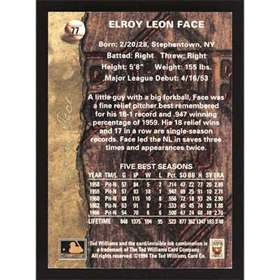 This is a 1994 Ted Williams Roy Face baseball card. The card is #77 and pictures show condition.