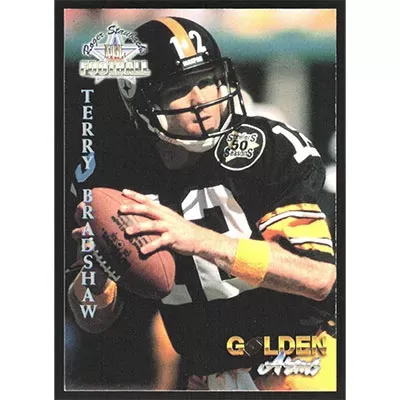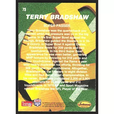This is a 1994 Ted Williams Roger Staubach's NFL Terry Bradshaw Golden Arms football card. The card is #73 and pictures show condition. Team: Pittsburgh Steelers