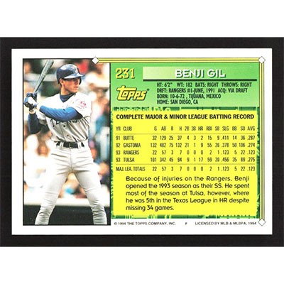 This is a 1994 Topps Benji Gil Future Star baseball card. The card is #231 and pictures show condition.