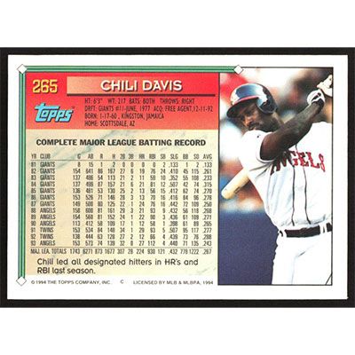 This is a 1994 Topps Chili Davis baseball card. The card is #265 and pictures show condition.