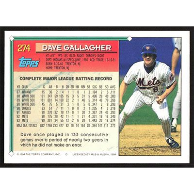 This is a 1994 Topps Dave Gallagher baseball card. The card is #274 and pictures show condition.