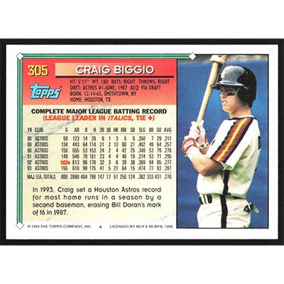 This is a 1994 Topps Craig Biggio baseball card. The card is #305 and pictures show condition.