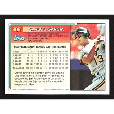 This is a 1994 Topps Carlos Garcia baseball card. The card is #309 and pictures show condition.
