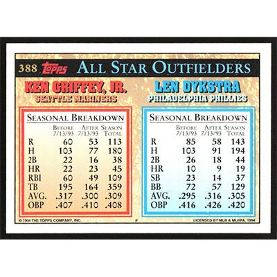 This is a 1994 Topps Lenny Dykstra and Ken Griffey Jr. All-Stars baseball card. The card is #388 and pictures show condition. Team(s): Philadelphia Phillies/Seattle Mariners