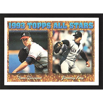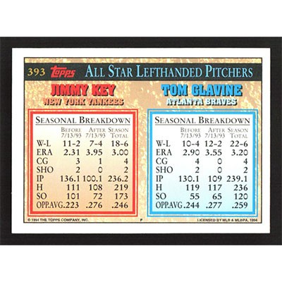 This is a 1994 Topps Tom Glavine and Jimmy Key All-Stars baseball card. The card is #393 and pictures show condition. Team(s): Atlanta Braves/New York Yankees