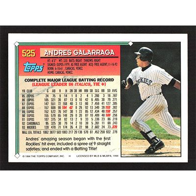 This is a 1994 Topps Andres Galarraga baseball card. The card is #525 and pictures show condition.