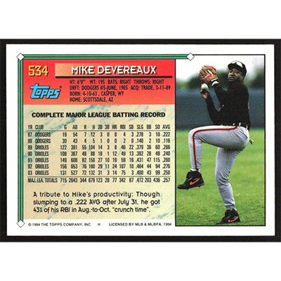 This is a 1994 Topps Mike Devereaux baseball card. The card is #534 and pictures show condition.