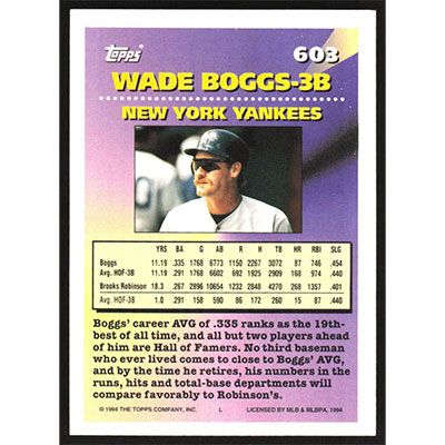 This is a 1994 Topps Wade Boggs Measures of Greatness baseball card. The card is #603 and pictures show condition.