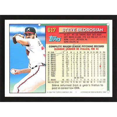 This is a 1994 Topps Steve Bedrosian baseball card. The card is #617 and pictures show condition.