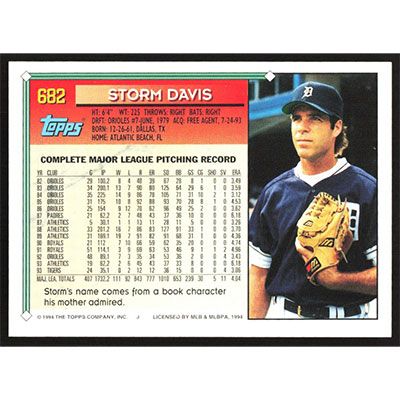 This is a 1994 Topps Storm Davis baseball card. The card is #682 and pictures show condition.