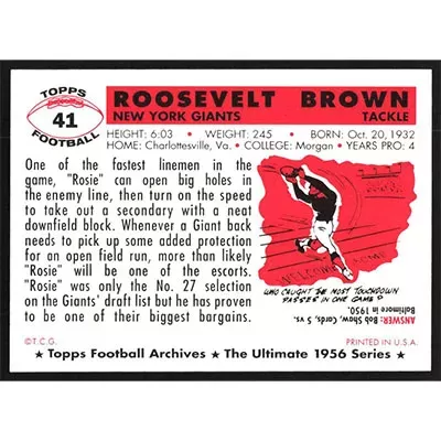 This is a 1994 Topps Archives 1956 Gold Roosevelt Brown football card. The card is #41 and pictures show condition.