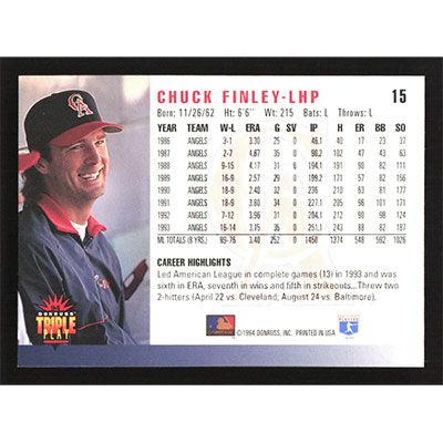 This is a 1994 Triple Play Chuck Finley baseball card. The card is #15 and pictures show condition.