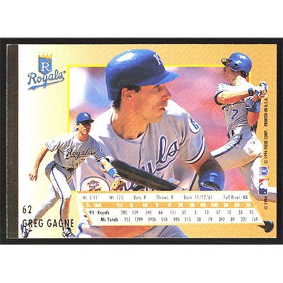 This is a 1994 Ultra Greg Gagne baseball card. The card is #62 and pictures show condition.