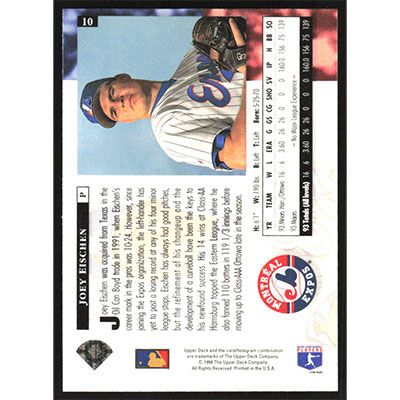 This is a 1994 Upper Deck Joey Eischen Star Rookies baseball card. The card is #10 and pictures show condition.