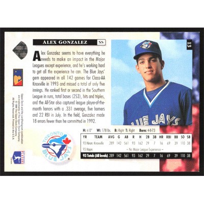 This is a 1994 Upper Deck Alex Gonzalez Star Rookies baseball card. The card is #13 and pictures show condition.