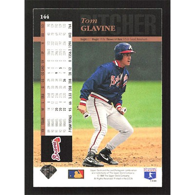 This is a 1994 Upper Deck Tom Glavine baseball card. The card is #144 and pictures show condition.