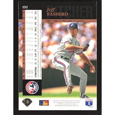 This is a 1994 Upper Deck Jeff Fassero baseball card. The card is #192 and pictures show condition.