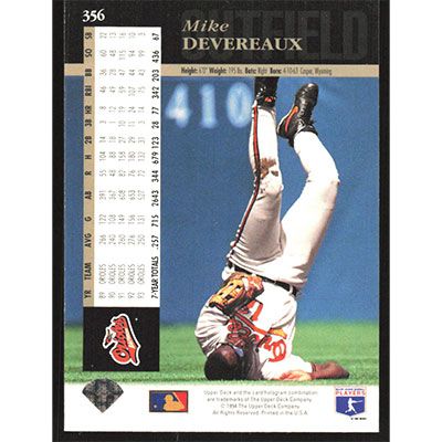This is a 1994 Upper Deck Mike Devereaux baseball card. The card is #356 and pictures show condition.