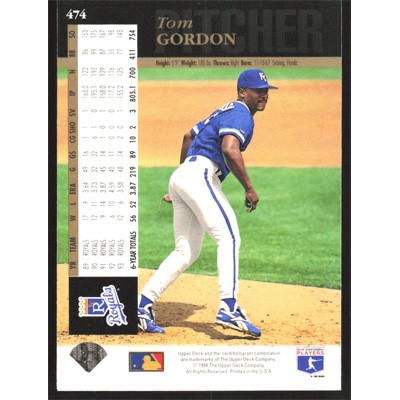 This is a 1994 Upper Deck Tom Gordon baseball card. The card is #474 and pictures show condition.