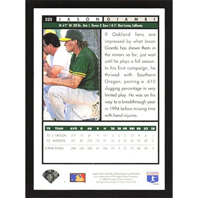 This is a 1994 Upper Deck Jason Giambi Top Prospects baseball card. The card is #525 and pictures show condition.