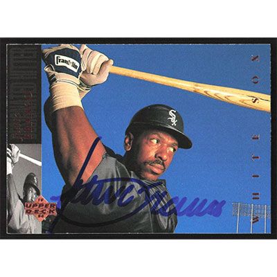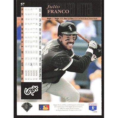 This is a 1994 Upper Deck Julio Franco autographed baseball card. This card has been signed, in blue, by Julio Franco, and is guaranteed authentic by Ballcardz.com. The card is #57 and pictures show condition.