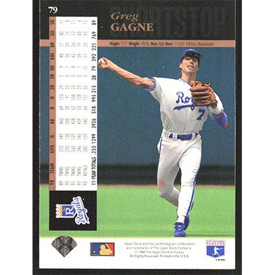 This is a 1994 Upper Deck Greg Gagne baseball card. The card is #79 and pictures show condition.